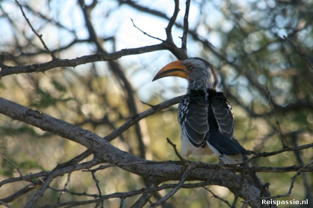 Om een uur of twee vertrokken. Mooi rondje van een uur of drie gemaakt. In eerste instantie niet heel veel gezien, een enkele Kudu en Springbok. Maar als we de pans (grote vlakte's) opzoeken gaat het helemaal los. Van alles loopt hier rond. Grote groepen Zebra's en Gazelle's, Giraffes, Struisvogels en kleinere antilopes die we nog eens moeten identificeren in ons boekje. Je kijkt je ogen uit! In de verte lopen vier neushoorns, keurig op een rijtje doorkruisen ze de vlakte. Vlak daarnaast loopt een secretarisvogel. Een enorme vogel die zich vooral lopend verplaatst en slangen eet. Het is heel grappig want onze nieuwe Zuid Afrikaanse vrienden zijn doorgewinterde safarigangers en als echte natuurgidsen overspoelen ze ons met weetjes. Als laatste gaan we naar een hut om vogels te spotten. Deze staat verdekt opgesteld naast een kleine waterpoel. Het krioelt hier ook weer van de vogels. De diversiteit is enorm, ik begon op een gegeven moment te tellen en zat zo boven de dertig verschillende soorten. Sommige hebben prachtige kleuren. Maar de grootste verrassing komt even later. Opeens komt er vanuit het niets een neushoorn met jong de hoek om waggelen om wat te gaan drinken in de poel. Op een meter of 15 bij ons vandaan! Heel bijzonder. Zelfs onze Zuid Afrikaanse safari die-hards hebben dit nog niet eerder meegemaakt. Geweldig! Dan teruggereden naar de campsite en afscheid genomen. Dit hebben we wel erg getroffen vandaag. Zoveel wild gezien op de eerste dag!