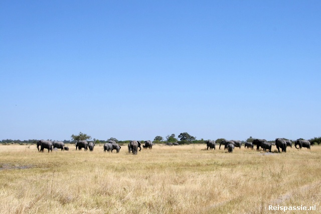 En dan het serieuze werk. Over een zandpad door dit prachtige gebied. Moremi maakt deel uit van het enorme Onkovango delta gebied maar is het enige beschermde stuk. In de rest mag gewoon gejaagd worden. Als gevolg daarvan zit er in dit deel veel wild. We zien al snel weer veel dieren; zebra, giraffe, olifant, wrattenzwijnen en vele soorten hoefdieren waarvan de Red Leeche het meest talrijk zijn. Het is een prachtig gebied. Ondanks dat het al een tijd droog is zijn de bomen nog behoorlijk groen. Op diverse plaatsen zijn waterpoelen en uiteindelijk kom je weer bij het rivierenstelsel van de Onkovango uit.