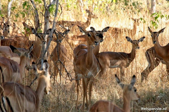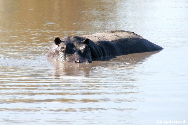 In de poelen en rivieren diverse nijlpaarden gezien. Halverwege de dag onder een groepje bomen geluncht, was inclusief, heerlijk gegeten. Het rijden over de zandpaden is een ware uitdaging, zelfs met 4x4. We staan verschillende keren vast in de zandmassa. Maar uiteindelijk krijgt hij hem altijd weer in beweging. Aan het eind van de dag nog een koppeltje jakhalzen gezien. Zien we toch nog wat roofdieren, want de leeuw, Cheeta en Luipaard laten zich vandaag niet zien.