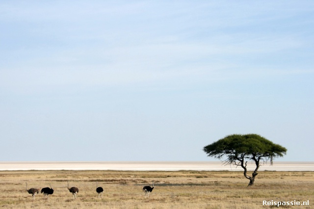 Het is 70 kilometer rijden naar de volgende campsite, Halili. Onderweg stoppen we nog even bij het uitzichtpunt over de Etosha zoutpan. Eindeloos verkijken in het oneindige niets. Wat een vlakte.