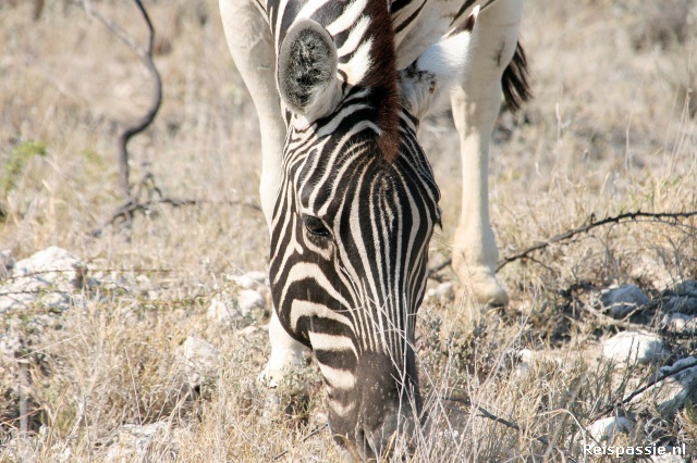 De dag er na door naar Etosha. Eerst even langs de plaatselijke super om proviand in te slaan en dan rijden maar. Niet zo heel lang want het is nog maar een 250 kilometer. Rond de middag bij de poort en vlak daarna is de campsite Namutoni. Plekje onder een boom gezocht en op het heetst van de dag lekker niets gedaan. Om een uur of vier een rondje gereden langs verschillende “waterholes”. Dit zijn plekken waar nog water te vinden is in dit droge gebied. En dus ook de plek waar de kans het grootst is om wild te zien. Het zijn vaak prachtige plekken om te zien, helemaal met de ondergaande zon op de achtergrond. Soms is er helemaal geen wild en wachten we een tijdje op wat komen gaat. Soms tevergeefs. Bij andere drinkplekken is het juist een drukte met van alles wat langs komt. Vooral heel veel giraffes in deze hoek. We sluiten af met een stukje Dikdik drive, Vernoemd naar het op een na kleinste hertje van Afrika wat hier veel voorkomt. We zien er inderdaad een stuk of wat lopen. Heel schattig, een hoog bambi gehalte.