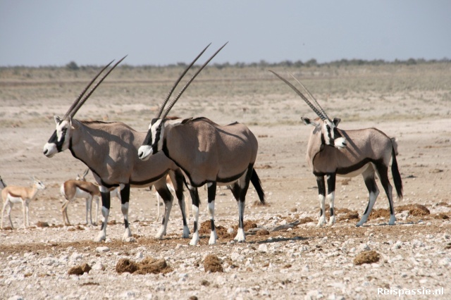 Dan onze laatste dag in Etosha, We rijden naar de Okaukuejo campsite. Nog wat prachtige plekken gezien. Een waterhole bulkt van het wild. Nog niet eerder zoveel bij elkaar gezien. Vooral Zebra's, Oryx (gemsbok) en Springbokken. Prachtig gezicht.