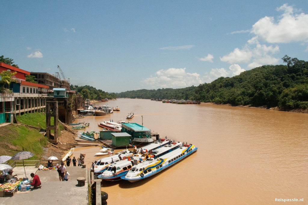 Vanuit Sibu gaan we weer het binnenland in. Met de speedboot want een weg is er niet. Het zijn weer de bekende langwerpige monsters die als een speer over de rivier gaan. We passeren enorme duwbakken gevuld met boomstammen en kolen die richting kust gaan. Het is een heel vermakelijk tochtje door een prachtige groene omgeving. Eigenlijk het fraaiste groen onderweg in Borneo tot nu toe. In drie uur bij onze bestemming: Kapit.