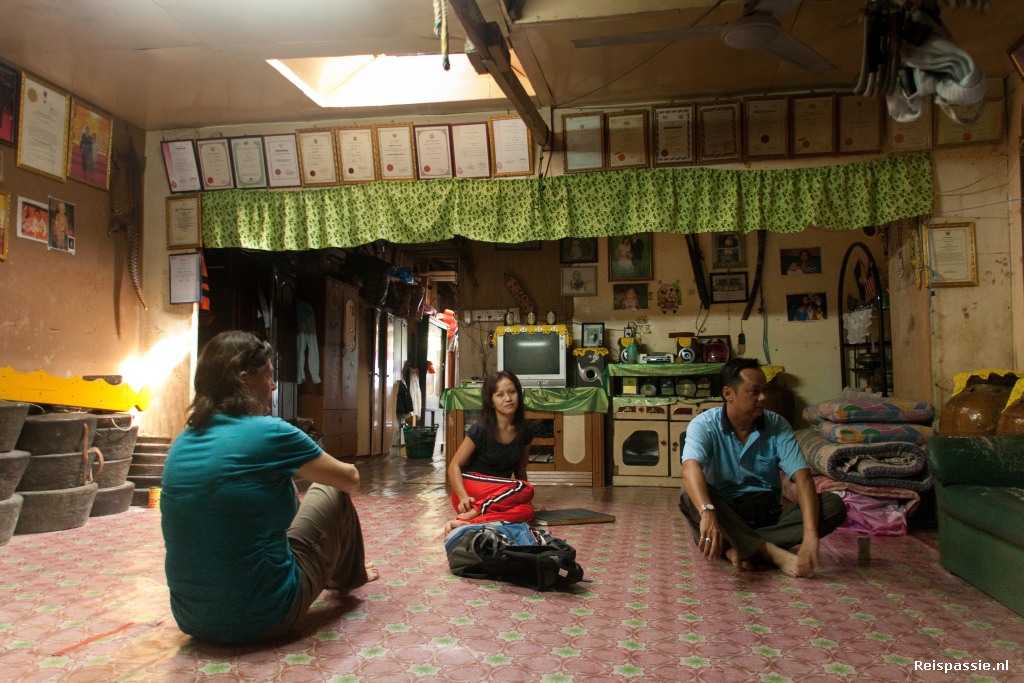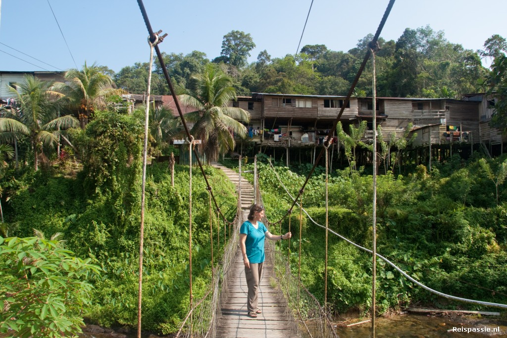 De longhouses zijn de traditionele woningen van de lokale bevolking. Ze staan op palen boven de grond van het regenwoud en huisvesten een hele gemeenschap. Het is een lange rij woningkjes onder een dak met een grote overdekte veranda waar het hele leven zich afspeelt. Het longhouse wat wij bezoeken is al 180 jaar oud! Inmiddels is er natuurlijk wel aan alle kante vernieuwd en heeft het ook grotendeels een golfplaten dak en wandjes van spaanplaat. En schotels op het dak want ook hier leven ze natuurlijk wel in de 21e eeuw. Maar de manier van leven is nog heel traditioneel.