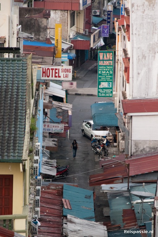 Maar de beloning is daar, prachtig uitzicht over de rivier en het beton en golfplaat van Sibu. Eigenlijk wilden we vanaf hier de zon zien ondergaan in de rivier, maar zoals zo vaak duikt hij net voor het “momant-surpreme” achter een wolk. Ach.