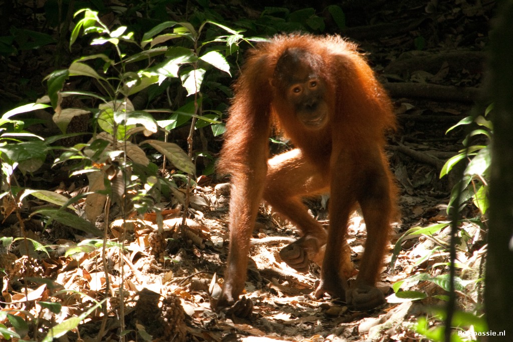 Wij gaan nu naar de achterzijde om de “bird watchers walk” te gaan lopen. Het is een smal pad van een kilometer wat uitkomt bij een ingestorte uitkijktoren. Overigens geen vogel gezien! Dan hetzelfde pad weer terug. Na een minuut of vijf ontdekken we twee orang utans in de struiken vlak langs het pad. Ze komen nieuwsgierig op ons af. Prachtig moment, midden in het bos alleen met twee orang utans! Ze komen heel dichtbij en volgen ons als we langzaam teruglopen over het pad. Na een minuut of tien komen we twee Duitse meiden tegen die de wandeling ook maken. Even gewaarschuwd; twee orang utans, lopen achter ons aan, houdt afstand. Maar de Duitse doos denkt dat ze Diane Fossey zelf is en blijft staan om ze te laten naderen. En die kans laten ze natuurlijk niet onbenut. Eentje klimt tegen haar op en grijpt de camera en begint er lekker op te kluiven. Maar het koordje zit nog om haar pols dus meenemen kan hij hem niet. Vervolgens pakt hij het mapje wat aan een touwtje om haar nek hangt en begint er flink aan te trekken. Inmiddels vindt de Duitse deze aanranding al lang niet meer grappig en begint in paniek te raken. Ze probeert hem af te schudden maar dat lukt natuurlijk never-nooit. Dus heb ik maar geprobeerd poot voor poot haar te bevrijden maar dat was weer de kans voor orang utan nummer twee die nu bij mij aan m'n benen hangt. Snel onze camera aan Anita gegeven voordat 'íe ook in een orang bekkie verdwijnt. En dan geprobeerd mezelf weer los te maken van de oranje aap. En dat valt dus echt niet mee, ze zijn lompsterk! Uiteindelijk laat hij even los en weet ik weer weg te lopen. De Duitse komt uiteindelijk ook los en rent helemaal in tranen de berg op. Doos.