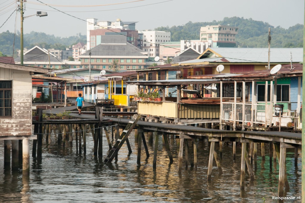 Ook een middagje door de paaldorpen boven de rivier gewandeld. Je loopt er zo vanuit de stad in. In totaal zijn het er 28 die tezamen de Kampong Ayer langs de Sungai Brunei rivier vormen. Het zijn enorme dorpen van huizen boven het water die onderling allemaal met houten vlonders en bruggen verbonden zijn. Overigens hier wel met voorzieningen als elektriciteit, water en riolering. Alleen het afval gaat kennelijk nog grotendeels zo de plomp in gezien de bergen troep die op plekken waar de stroming wat minder is zich verzameld. Het zijn vaak ook enorme huizen die echt niet onderdoen voor die op de wal. Onderweg nog een half uurtje een enorme tropische bui gehad. En dus even zitten schuilen onder een afdakje. Twee hengelaars die naast ons komen zitten schuilen laten even wat foto's zien van de vangst van een paar weken geleden; een enorme vis van 25 kg. Hij is bijna net zo groot als het mannetje zelf. Gevangen vlak bij de plek waar we nu zitten te schuilen. Een mega-exemplaar.