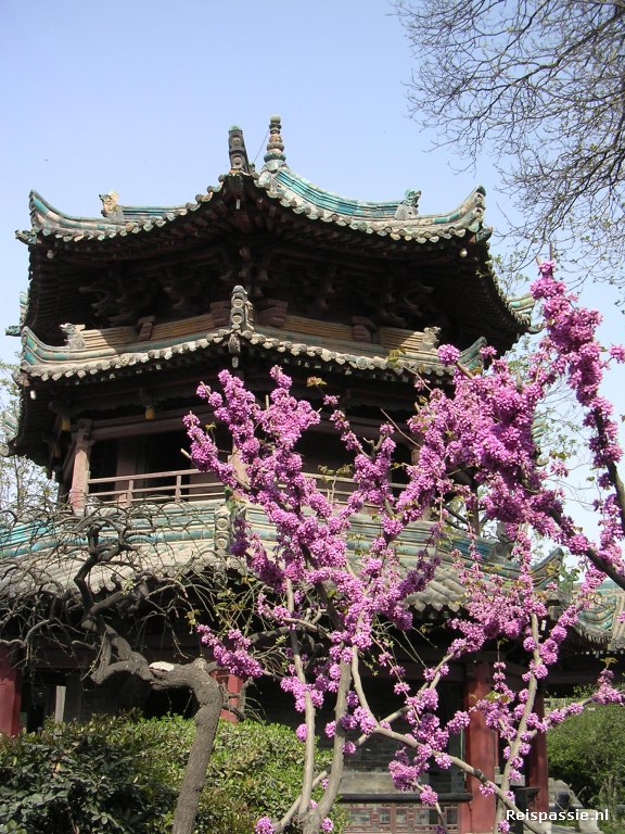 Waarschijnlijk zijn er door de jaren heen wel eens wat fietsjes blijven staan en die kunnen wij krijgen. Nu loopt de conversatie niet helemaal soepel maar zoals zo vaak is er dan opeens iemand die weer een beetje Engels spreekt. Dit maal een snuitertje van een jaar of 10. Hij babbelt al een aardig mondje Engels en de deal is nu snel gesloten. Voor 15 Yuan zijn wij de hele middag eigenaar van twee prachtige Chinese fietsen. Ze zijn model begin 1900 met van die enorme stalen handremmen (die natuurlijk niet werken) en de frame hoogte is afgestemd op de gemiddelde Chinees. Laat die nu ongeveer half zo groot zijn als ik.... Het zijn dus vrij kleine fietsjes. Voor Anita nog niet zo'n probleem, maar ik kom met m'n knieen boven het stuur uit. Afijn we hebben fietsjes en zijn dus al dik tevreden. Het levert voor de lokalen in elk geval een vermakelijk gezicht op zo'n lange blanke slingerend op z'n fietsje door de straten. De hele middag hebben we door het centrum gereden. Het is deels heel modern met westers aandoende winkelstraten, maar ook mooi authentiek in de moslimwijk. Hier ook een heel oude moskee bezocht. Niet te vergelijken qua bouwstijl met de moskeen zoals wij ze kennen. Een heel eigen Ming architectuur. Het mooie van dit soort plaatsen is ook dat ze altijd en oase van rust in de hectische binnenstad zijn. Lekker om even uit te rusten dus.