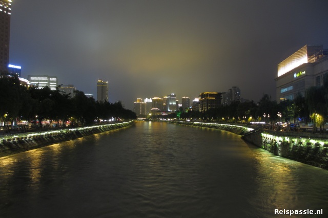 Zodra het donker wordt gaan we de stad in richting het grote Tianfu plein. Hier veel fonteinen met verlichting, een beeld van Mao, agenten op de Stepway die tussen de menigte door scheuren en continue klassieke muziek op de achtergrond. En eigenlijk een heel relaxed sfeertje. Veel van de omringende enorme hotel- en banktorens hebben neon verlichting en dat geeft een mooi plaatje tegen de donkere hemel.