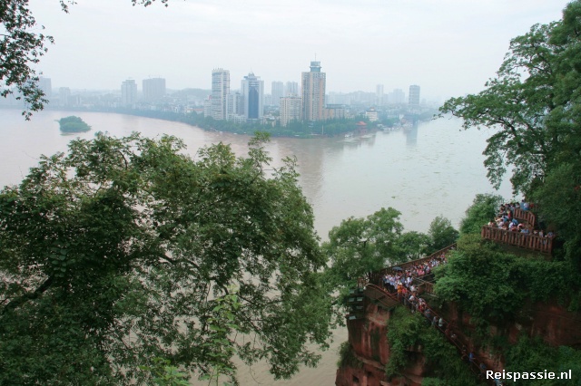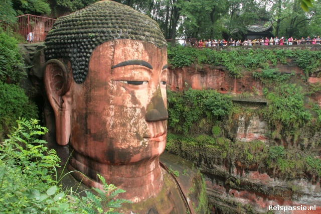 De laatste dag naar de Great Boeddha van Leshan geweest. Volgens de mensen hier de grootste ter wereld (maar dat hebben we vaker gehoord). Groot is hij echter zeker. Uit de rotsen gehakt aan de oever van een rivier is het een mooi plaatje. Voor zover je echt wat ziet want ook hier is het natuurlijk weer eens druk. De rij van mensen die staat te wachten om af te dalen via een trap naar de voeten van de boedha zodat je het geheel kan zien is al weer van tenenkrommende omvang. Dat doen we dus maar even niet. Vrijwel alle Chinezen zijn hier in groepsverband en hebben een gids mee die vertelt over al dat moois. En alle gidsen hebben een geluidsversterker met microfoon waar vol overtuiging in gebruld wordt. Het is er dus een gezellige kakofonie van geluiden. Gelukkig zijn er ook nog wat tempels te zien waar het er rustiger aan toe gaat.