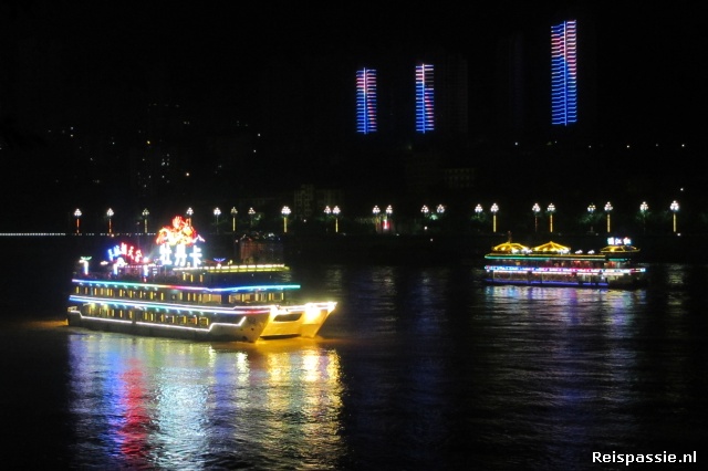 Het centrum van Chongqing ligt op een heuvel die aan twee kanten wordt omsloten door rivieren; de Yangtze en de Jialing. Vlak bij het punt waar de rivieren samenvloeien staat ons hostel. We kijken uit op de cruiseschepen die hier vertrekken voor de bekende tochten over de Yangtze rivier.