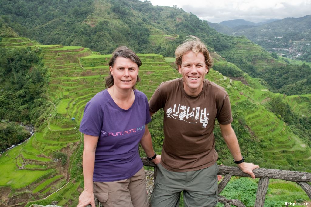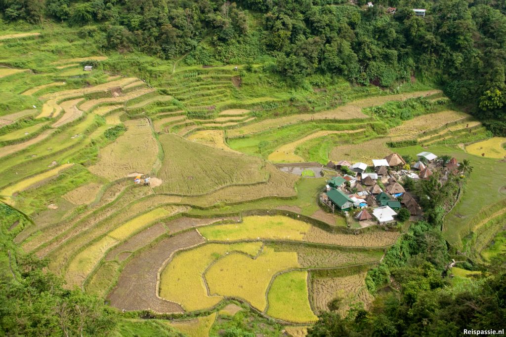 Vanaf hier is het lopen richting Batad. Een anderhalf uur door de bergen, eerst omhoog en dan het dal in richting de rijstvelden. In het dorpje aangekomen zijn de uitzichten prachtig. Vandaag is het zonnig en de veldjes kleuren van groen tot geel. Hier een uurtje bij een restaurantje op de veranda gezeten en genoten van het uitzicht en de lokale pizza. Schitterende plek, de rijstterrassen hier zijn al tweeduizend jaar oud, niet voor niets op de Unesco werelderfgoederen lijst.