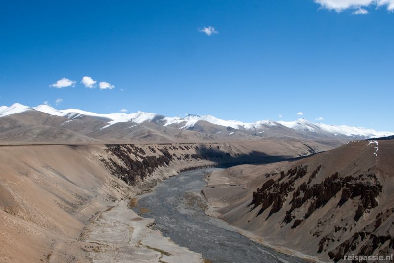 Vanaf hier is het alleen maar naar beneden, eerst vlak langs een rivier door een smal dal, vervolgens door een breed dal langs mooie Tibetaans dorpjes. En dan zien we voor het eerst de Indus rivier. De rivier waar India zijn naam aan ontleent. Hier nog een vrij smalle rivier die we volgen tot Leh.