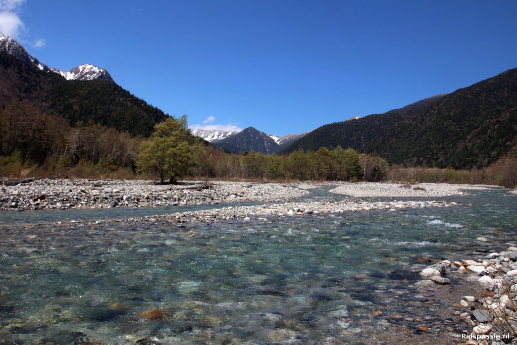 Hier vandaan vertrekt het boemeltje wat richting Kamikochi gaat. Het dient gelijk als lokaal vervoer en we stoppen minstens 10 keer onderweg. Bij de laatste halte moet er overgestapt worden op de bus. Om het ook fraai te houden in de toekomst is het park niet toegankelijk voor auto's, alleen bus en taxi rijden het laatste stuk. Het is nog een uurtje met de bus grotendeels door de ontelbare tunnels die in dit traject zitten. Als we dan even in de buitenlucht rijden ziet het er steeds fraaier uit, smalle dalen met wilde rivieren tussen de hoge bergen.