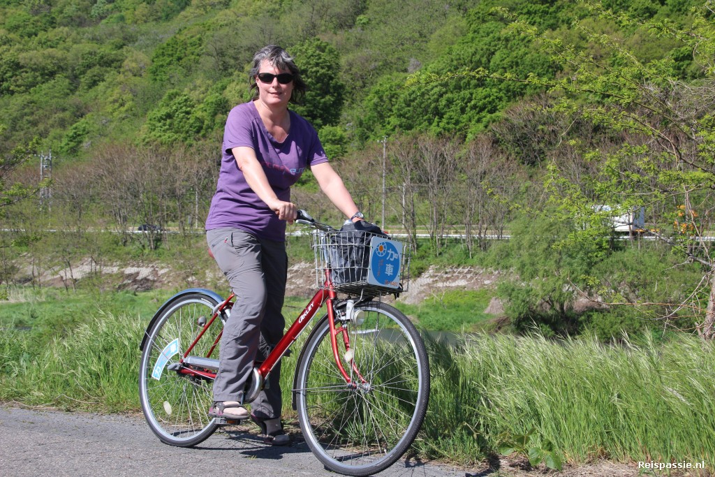 Ook gaan we een dag met de fiets op pad. We kunnen ze zo meenemen bij het hotel, dus op de bekende veel te kleine fiets-met-mandje de omgeving in. Op goed geluk een route bedacht maar dat pakte aardig uit. Eerst naar een uitzichtpunt op een heuvel gegaan. Het ligt in het Joyama parkje op de top. Om er te komen moet er aardig geklommen worden. Met zo'n ienieminie fietsje betekend dat dus gewoon lopen. Fraai uitzicht over de stad en de bergen er om heen. Ook een lekker verkoelend windje hierboven want we hebben weer een prachtige warme dag. Dan door de heuvels naar het Alps park iets verderop. Wederom om af en toe lopen en dan weer de heuvel af suizen. Dit is een veel groter park en het is er druk van de gezinnen die zitten te picknicken. Lekker een uurtje gezeten. En dan de beloning van al ons klimwerk, de afdaling naar de rivier. Vrijwel het hele stuk downhill!