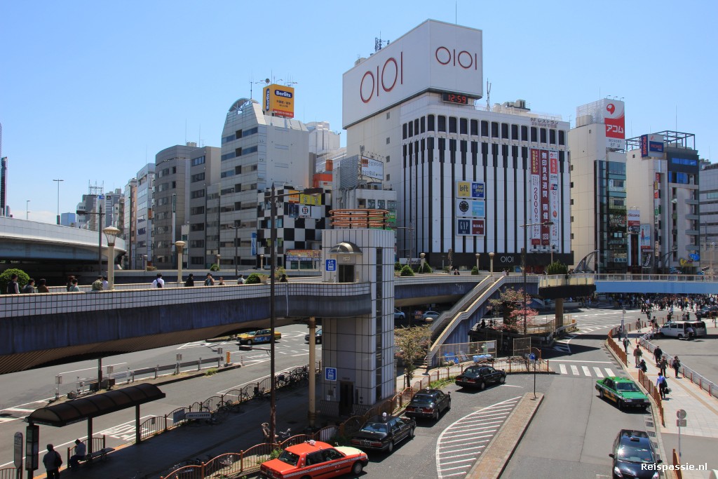 Later lopen we onder diezelfde gebouwen door als we richting metro gaan. Ze zijn echt reusachtig. Ook hier is alle infrastructuur gestapeld. Als we op een terrasje wat eten rijdt onder ons de metro, is op ons niveau een winkelcentrum, daarboven een voetgangers galerij en daarboven weer een treinstation. En er tussendoor nog een autoweg. Handige jongens die Japanners. En het voordeel is dat je heerlijk rustig op een terras zit terwijl aan alle kanten verkeer gaat. Je merkt er niets van.