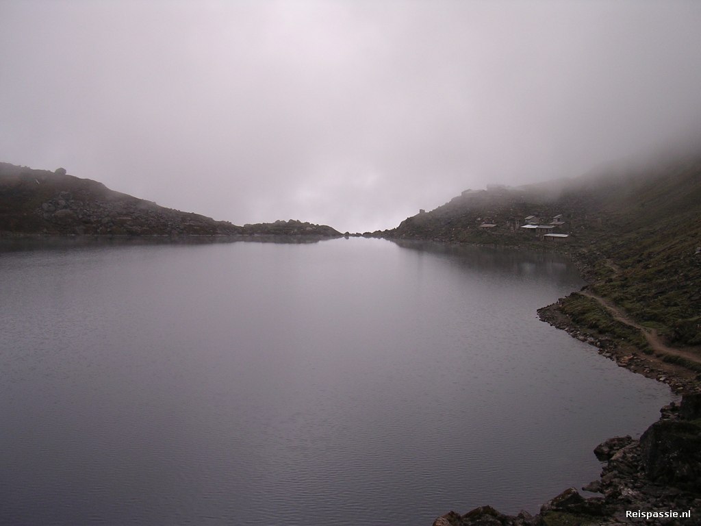 De derde dag starten we ook weer vroeg. Vannacht niet zo goed geslapen door de hoogte, verder geen problemen met de hoogte. Al voor zevenen lopen we langs de meertjes. Ze liggen er mysterieus bij in in de wolkennevel. Vandaag gaan we over het hoogste punt van de trek, een pas op 4600 meter. Er ligt hier dan ook nog aardig wat sneeuw.