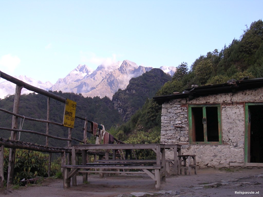 Dag 5. Het regende al vanaf een uur of twee vannacht en we zijn vandaag dus ook maar wat later opgestaan. Rond half acht werd het gelukkig droog. We lopen nu tussen de terrasakkertjes door en komen langs kleine dorpjes. Nu we lager komen wordt het weer ook wat beter en hebben we weer uitzichten in de valleien. In de middag in Chipling aangekomen. Hier gelunched. We lopen vervolgens van vallei in vallei. Toen we vanochtend de kaart bestudeerden leek het een dag van afdalen te worden maar in de praktijk zit er toch nog heel veel klimmen ook in. Om vijf uur in Chisapani bij een mooie "lodge". Het BBC mount view hotel.