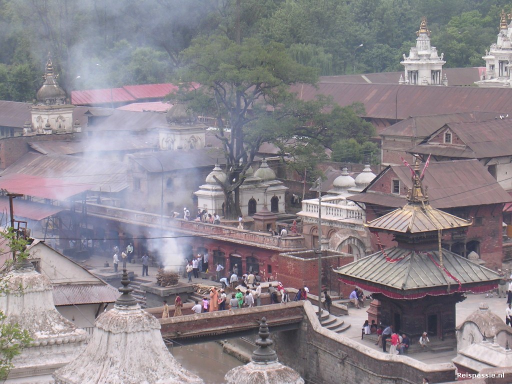 Daarna zijn we gaan lopen naar de Pashupatinath tempel. Dit is een hindoeistische tempel. Een heel ander complex. Je kan deze tempel niet van binnen bekijken als je geen hindoe bent. Langs de tempel loopt de heilige Bagmati rivier. Hier worden lijkverbrandingen gehouden. Deze zijn gewoon openbaar en er verzameld zich al snel een kleine menigte Nepali die het vanaf de overkant van de rivier volgt. De kist wordt naast de brandstapel gezet en er wordt eerst gebeden en er worden bloemen geofferd. Dan wordt het lijk op de brandstapel gelegd en gecremeerd. Tijdens ons bezoekje waren er twee lijkverbrandingen. Verder ons voorbereid op de trekking. We hebben een kaart gekocht van het gebied waar we willen gaan lopen en nieuwe regenponcho's want het kon ook wel eens gaan regenen.