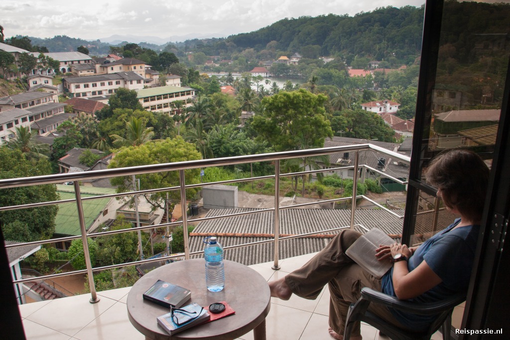 Kandy ligt laag in de bergen maar is toch al wat koeler dan in het laagland. De stad zelf is vergeven van bussen en ziet blauw van de smog. Goor stadje. Maar..., loop je 15 minuten uit het centrum langs het meer van Kandy en vervolgens de heuvels in dan is het een totaal ander verhaal. Heuvels met grote bomen en slinger weggetjes tussen de huizen door. Dit is waar we zitten in een guesthouse met uitzicht op het meer. Helemaal niet verkeerd.