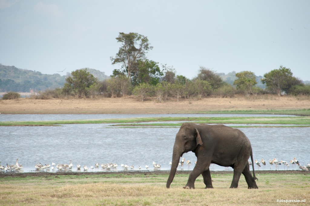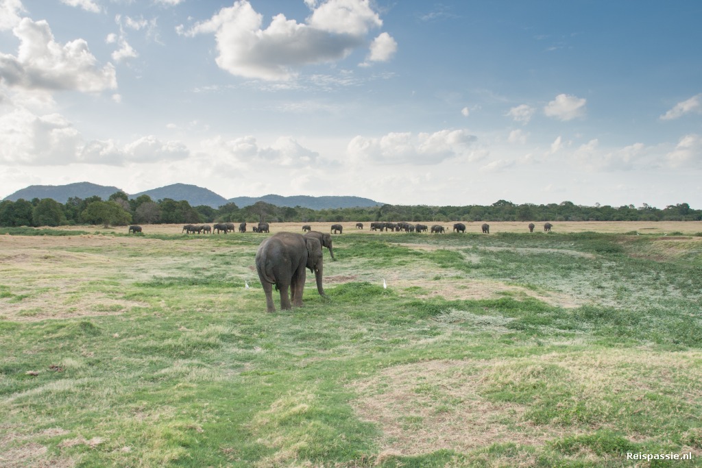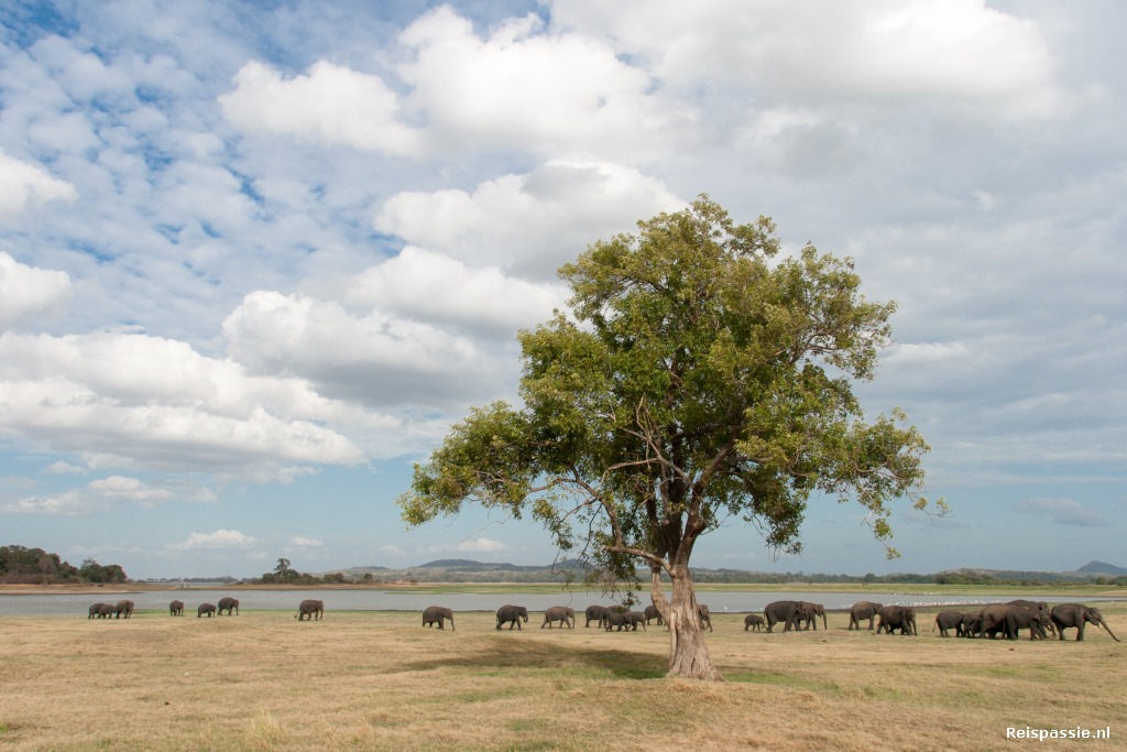 We zien in het bos ook geheel geen dierenleven. Dat veranderd echter als we de vlakte bij het meer oprijden. Er lopen een groot aantal kuddes olifanten. In totaal zeker een honderdvijftig. Ze staan te grazen en lopen wat richting het water. Prachtig gezicht in deze omgeving. Het heeft eerder iets weg van een safari in een Afrikaanse savanne dan een landschap wat je verwacht in Sri Lanka. Geweldig om olifanten op deze manier te zien. Het is de eerste keer dat we ze in het wild zien.