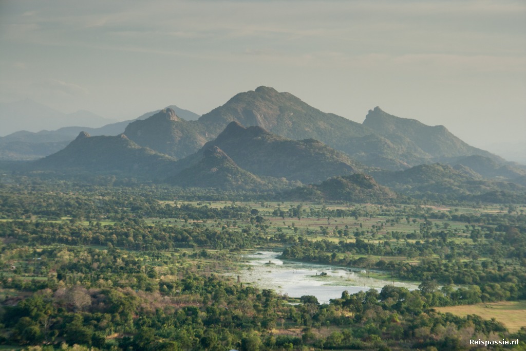 Dan naar “de rots” gegaan. Wereldberoemd in heel Sri Lanka (en daarbuiten). Hij ligt in het dorpje Sigirya een uurtje of twee met de bus vanaf Pollonaruwa. We zijn dus al voor de middag in dit fraaie kleine dorpje. Lekker rustig tussen de rijstvelden. Kamertje gevonden bij de Lakmini Lodge. De eigenaar heeft aan de achterzijde een hut op palen gebouwd van waaruit je een prachtig uitzicht op de rots hebt. Die middag eerst wezen zwemmen bij een hotel uit de wat duurdere categorie. Kost je een euro maar dan lig je ook wel lekker in het zwembad te dobberen.