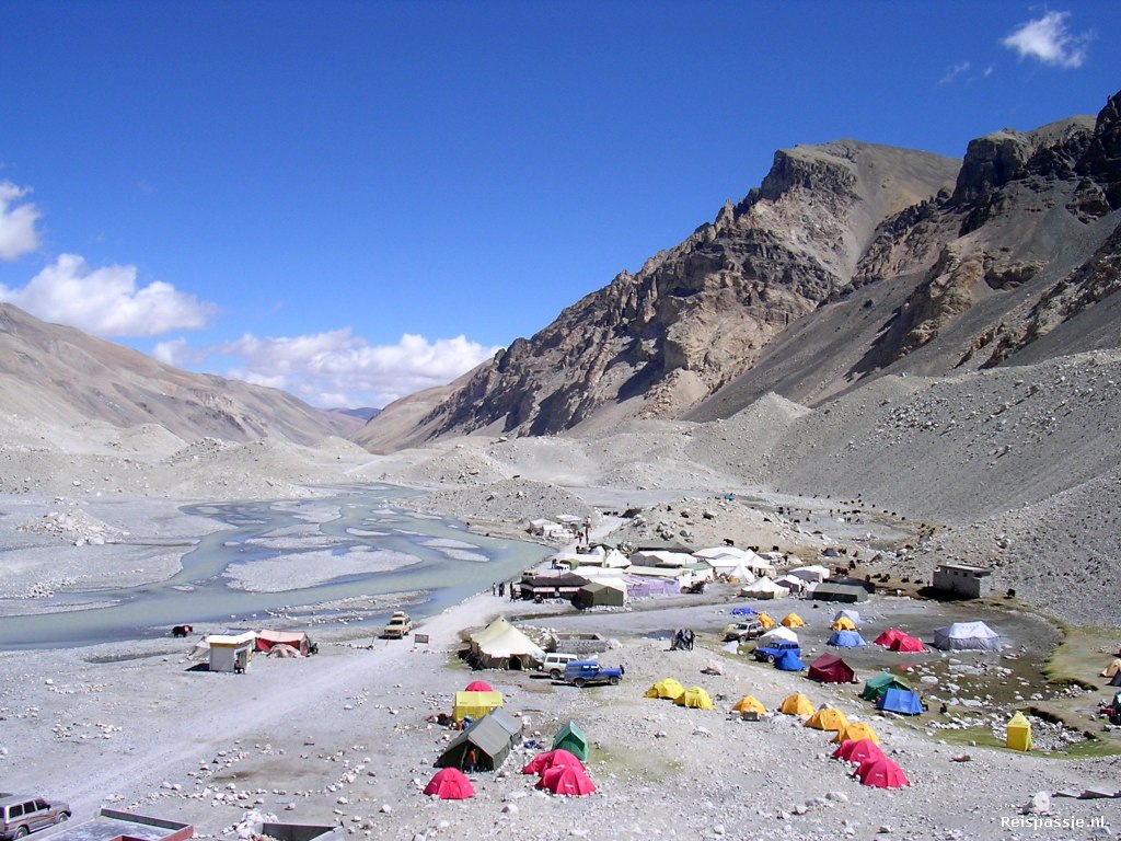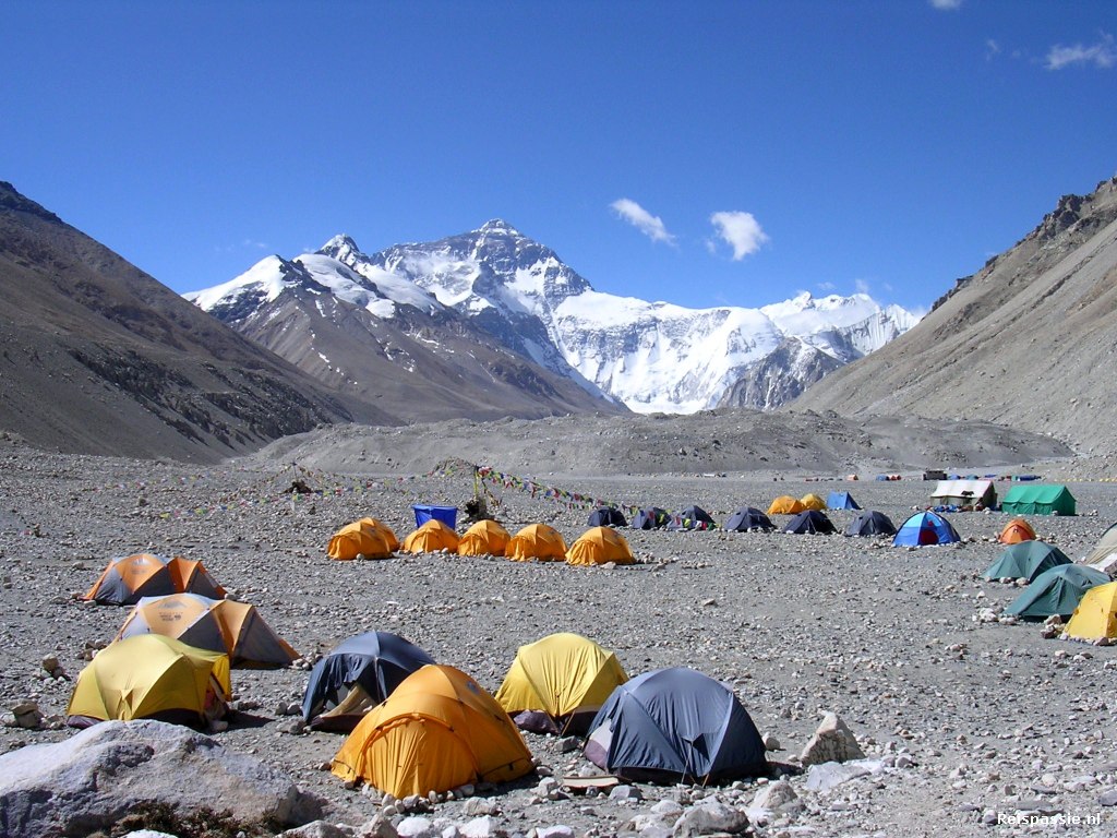 Bij het basecamp is het een en al bedrijvigheid en er hangt een heel prettig sfeertje. Er staat een klein dorp aan tenten van Tibetanen die er hun yaks verhuren en restaurantjes en andere handel hebben. Iets verder staan de Northface tenten van de expedities. We lopen tot we een mooi plekje hebben om wat te relaxen. Dan is het eerst even bij-bunkeren want je wordt wel snel hongerig en dorstig op deze hoogte. Snicker tijd!