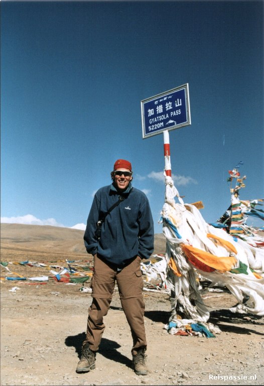 Om acht uur weer op pad gegaan. Zodra we de "Friendship highway" weer op rijden is de weg weer onverhard. Al snel passeren we Lhatse en gaat de weg weer stijgen. We naderen het hoogste punt uit ons Tibet avontuur: de Gyatsola pas van 5220 meter. Het waait behoorlijk boven op de pas en het is dan ook aardig koud. De gebedsvlaggetjes wapperen hard in de wind. Maar de uitzichten zijn weer geweldig en dan vergeet je even dat je het koud hebt.