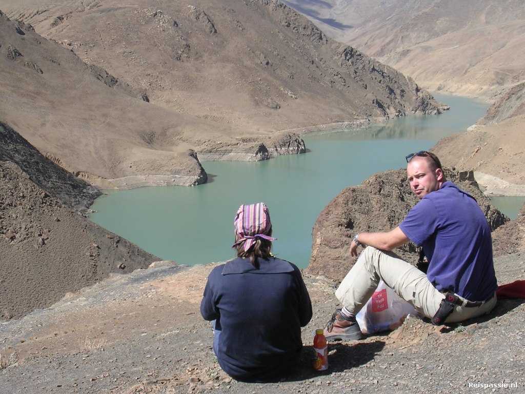 Bij de Karo-la pas is het uitzicht geweldig. Er is hier een stuwmeer wat zich tussen de bergen heeft gewrongen. Vanaf het hoogste punt zie je het meer drie kanten opgaan. De turqoise kleur past mooi bij het bruin van de bergen. We hebben hier gelijk maar een korte lunch gehouden want het is een prachtige plek.
