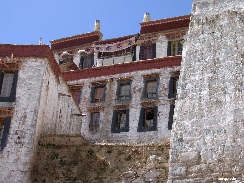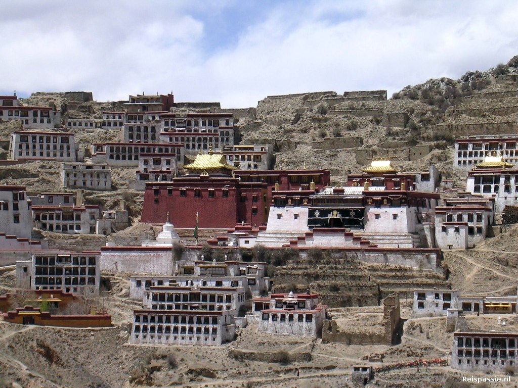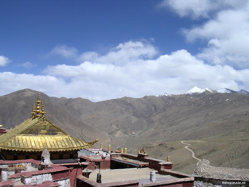 De laatste stop is bij het Ganden klooster. Dit is een groot kloostercomplex gelegen op 4800 meter hoogte. Een stoffig pad slingert naar boven.