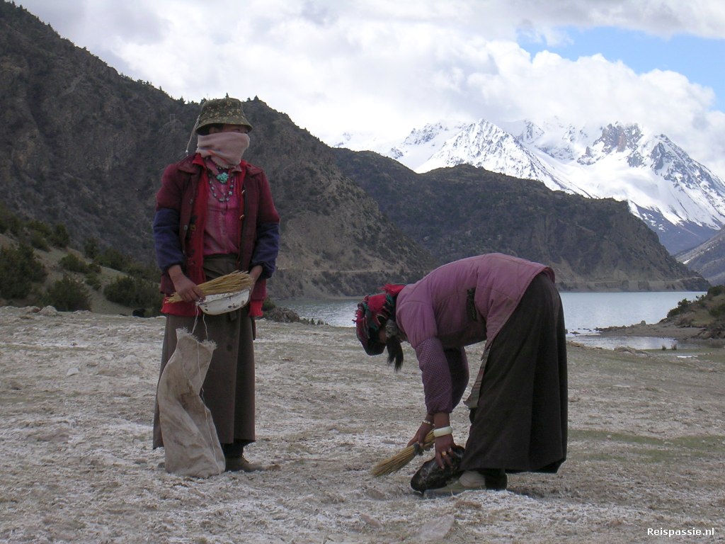 Vrouwen lopen op drooggevallen stukken met een bezempje het zout te verzamelen. Het is echt een idyllisch plekje. Veel foto's gemaakt.