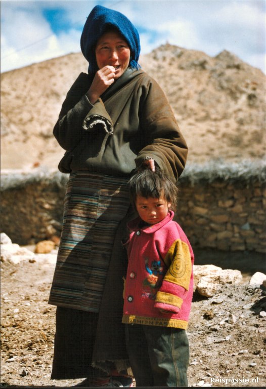 Na het bezoek aan het klooster door het dorpje gelopen. Het zijn allemaal eenvoudige lemen huizen van boeren families. Op elk huis staat wel een paal met gebedsvlaggetjes. Een wandeling door het dorpje brengt gelijk een hoop mensen op de been. Kennelijk gaat het als een lopend vuurtje dat er "vreemden" zijn. De mensen zijn heel verlegen en lijken echt voor het eerst westerlingen te zien. Bij een huisje staat een vrouw die ons graag haar huisje wil laten zien. Het is de indeling die we al eerder bij Tibetaanse huizen hebben gezien; een buitenmuur waar de verblijven tegen aan zijn gebouwd en in het midden de binnenplaats. Er scharrelen wat kalveren en biggen in het rond. De huiskamer is opgezet rond de kachel/fornuis en de grote koperen pannen staan tegen de muur opgestapeld. Het is een klein en knus onderkomen.