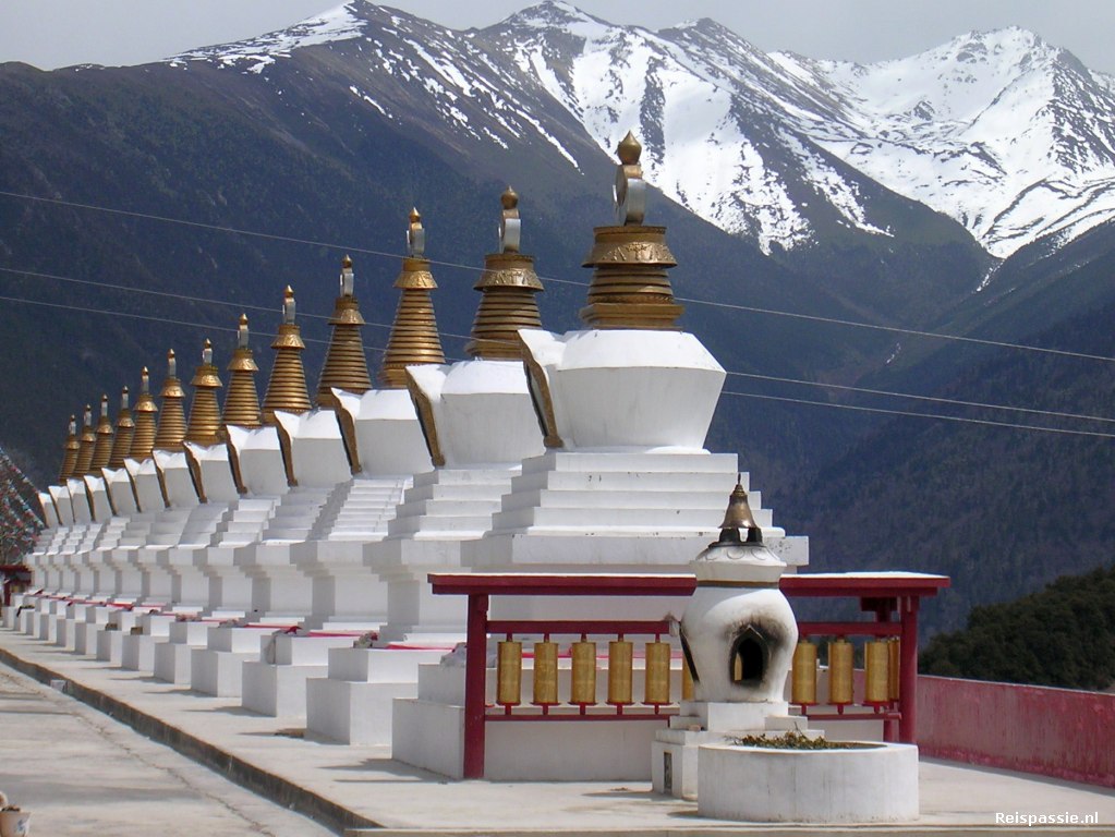 We rijden over een knappe weg, waarschijnlijk net geasfalteerd. Onderweg passeren we verschillende stupa's, of chortens zoals ze hier heten, die allemaal vol hangen met kleurige gebedsvlaggetjes. De hoogste pas van vandaag is 4292 meter. Ook hier boven hangt het vol met vlaggetjes. Bij een klooster gestopt voor een bezoek. Het is een mooi oud klooster. We krijgen uitvoerige uitleg over de Tibetaanse geloofsbeleving. De monniken in de gebedszaal gaan ondertussen onverstoord verder met hun gebed.