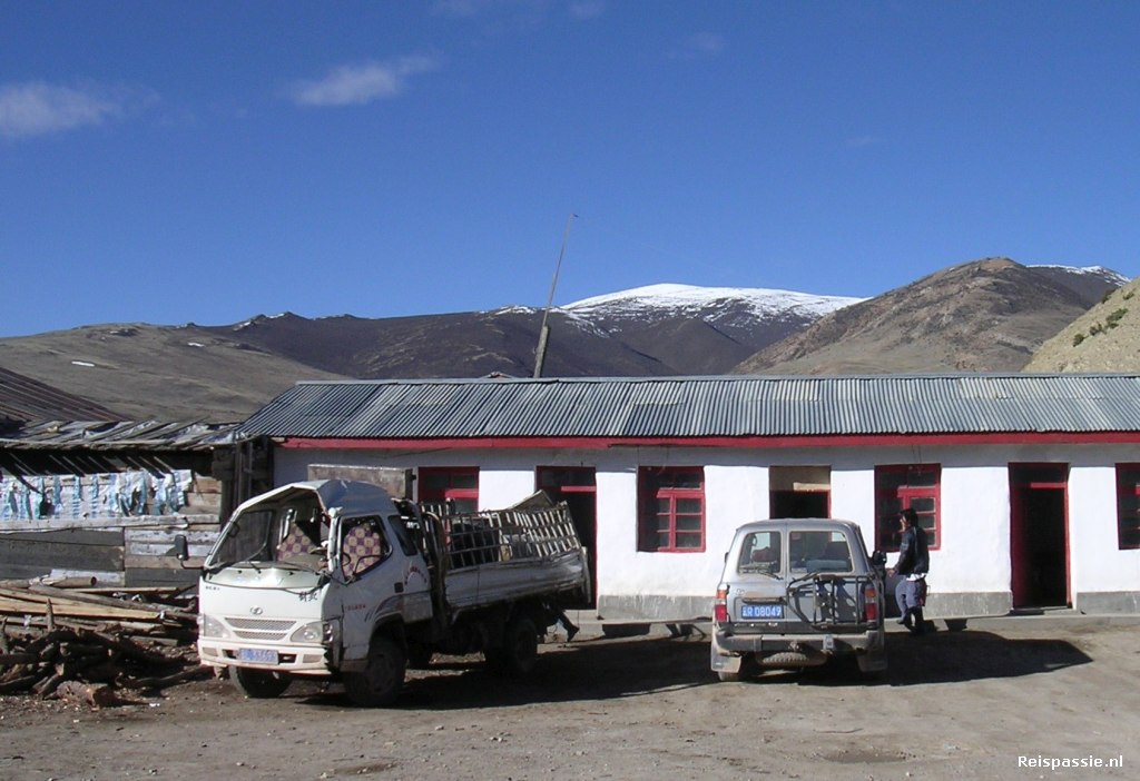 Hierna ging de route verder naar Dzogang, hier om half 10 aangekomen. We krijgen te horen dat er iets verderop weer een roadblock is wegens wegwerkzaamheden. Hierdoor is de weg morgen tussen 07:00 en 22:00 gesloten. Dit is voor ons natuurlijk wel erg ongunstig. We besluiten daarom om vanavond nog maar verder te rijden naar Pomda. Het wordt zo een erg lange dag maar het is beter dan morgen te moeten wachten. En zo rijden we in het pikkedonker tussen de enorme bergen door. Het is een hoog stuk en de sneeuwvelden lichten op in het maanlicht. We passeren om elf uur s' nachts de hoogste pas uit de trip: 5116 meter. Om half een aangekomen in Pomda. Dit gehucht ligt op de kruising tussen de noordelijke en zuidelijke "highway". Het is vooral een stopplaats voor truckers. In een simpel guesthouse een kamer voor z'n vieren genomen. Het is hier behoorlijk koud, we overnachten dan ook voor het eerst boven de 4000 meter. Maar gelukkig hebben we de slaapzakken bij ons. Deze en de dekens uit het guesthouse zijn net genoeg om warm te blijven.