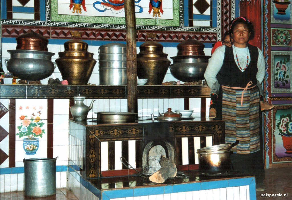 We hebben vandaag een rustige start. De weg is nl. iets verder op tot twaalf uur gesloten wegens wegwerkzaamheden. We gaan eerst een paar huizen in het dorpje waar we nu zijn bezoeken. De Tibetaanse huizen hebben allemaal dezelfde bouw. Ze zijn robuust gebouwd met witte buitenmuren en prachtig geverfd houtsnijwerk rond de ramen. De huizen die we bezoeken zijn vrij recent gebouwd. Beneden zijn stal en en werkplaats, boven is de woon/slaapkamer annex keuken.
