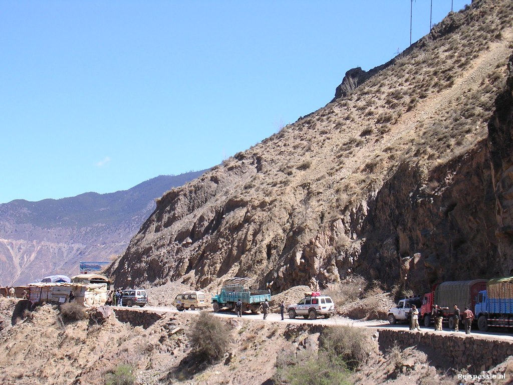 Het duurt natuurlijk allemaal veel langer dan verwacht. Pas om half twee kan er weer gereden worden. De route is weer fantastisch. De weg slingert op een hoogte van 3500 meter langs de ravijnen. Je moet hier geen hoogte vrees hebben! Gelukkig hebben we een goede chauffeur want vrijwel nergens is er iets wat de weg en ravijn scheidt. Een stuurfoutje en je verdwijnt met auto en al in de diepte. We passeren twee passen boven de 4500 meter; geweldige uitzichten!
