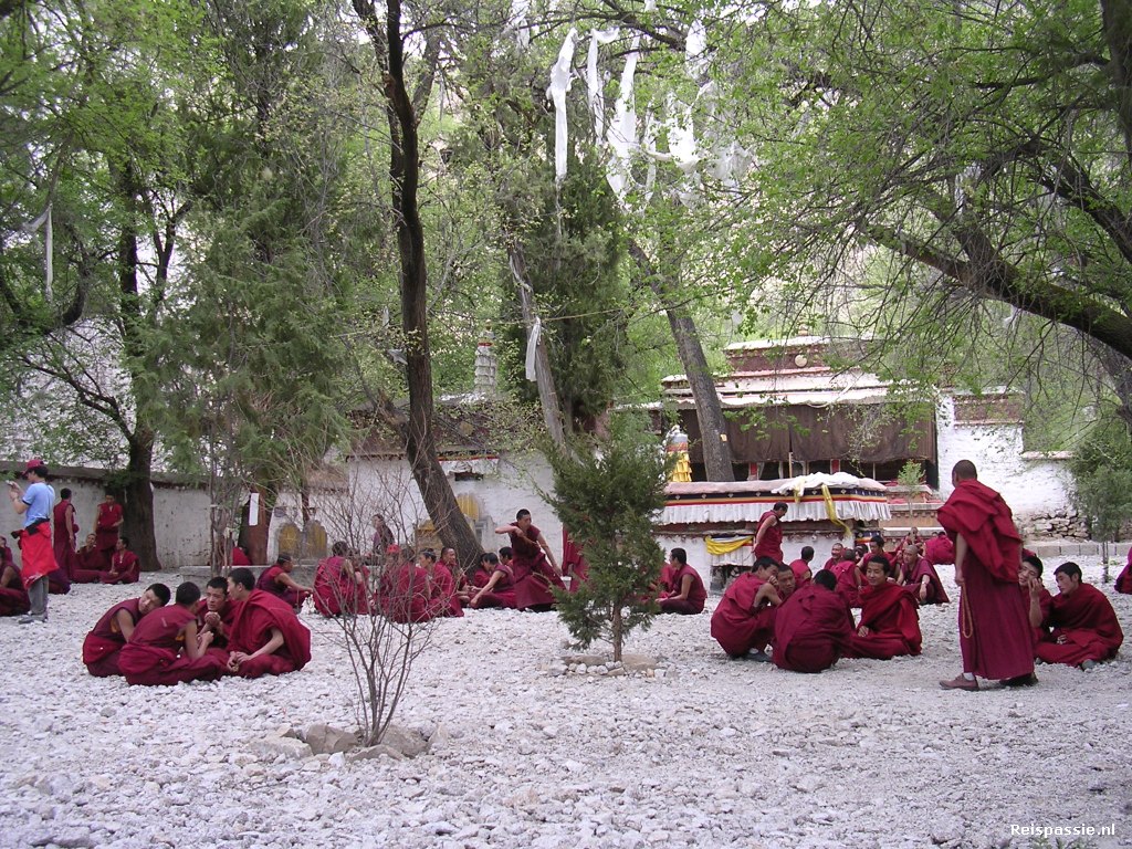 Dan de bus genomen naar het Sera klooster. Het ligt tegen een heuvel aan de buitenkant van Lhasa. Echt heel bijzonder is het niet. Misschien zijn we al te veel verwend maar het maakte niet al te veel indruk. De echte reden voor het bezoek komt later die middag. Om een uur of drie verzamelen een heleboel monniken zich op een binnenplaats voor hun debatten. Ze gaan dan met veel uiterlijk vertoon met elkaar in debat. De geoefende staan wild gebarend de beginnelingen die zitten uit te dagen in hun debat. Hoewel we een beetje sceptisch waren gezien de vele toeristen die dit trekt, zou het geen opvoering zijn?, was het wel erg de moeite waard. De monniken gaan volledig op in hun debatten die er soms heel fel aan toe gaan.