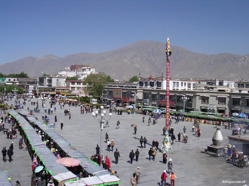 Het Potala is die andere indrukwekkende attractie van Lhasa. We kwamen hier om negen uur 's ochtends om te ontdekken dat er alleen nog toegangskaarten voor drie uur 's middags waren. En we wilden toch graag in de ochtend dus diezelfde dag weer heen want vanaf vier uur 's middags verkopen ze kaarten voor de volgende dag. Erg ingewikkeld allemaal want je krijgt niet eens een kaartje maar een bewijs waarmee je boven een kaartje mag kopen. Afijn, ons bewijs was binnen dus de dag erop naar het paleis. We hebben al die tijd dat we hier zitten al stralend weer en ook vandaag is het weer prachtig.