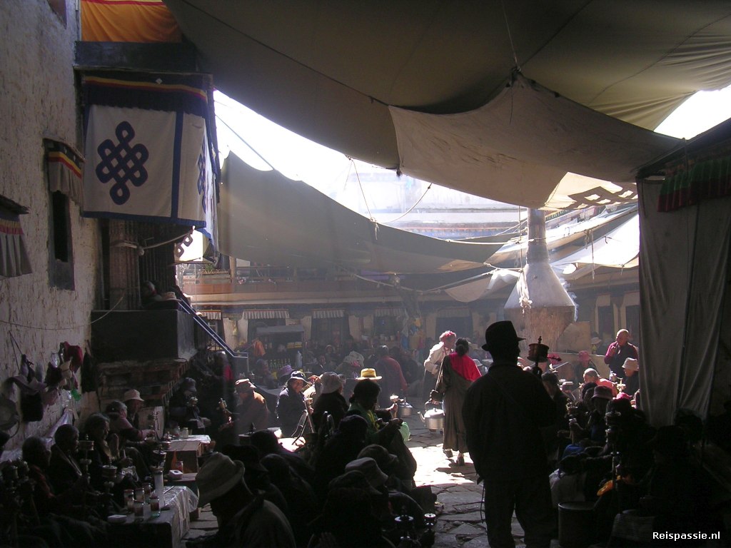 Op zondag weer een ijverige dag gehad. We zijn eerst naar het Bakhor gelopen om wat kleine tempels te bezoeken. Het is er weer een drukte van belang. Bij een van de tempels is een dienst en heeft zich een grote groep mensen verzameld. Iedereen draait z'n eigen gebedsmolentje. Zowel op de binnenplaats en in de tempel zelf zit het vol. In een enorme ketel is men voor alle aanwezigen yakboterthee aan het maken. Mooi sfeertje.