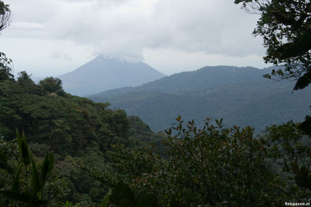 Het wildlife houdt zich vandaag goed verscholen. We zien wat 1000-poten voorbij schuifelen en veel vogeltjes maar pas na twee uur lopen komen we een groep kapucijnapen tegen. Ze zitten hoog in de toppen en slingeren van boom naar boom. Maar het woud zelf is eigenlijk al voldoende, zo ontzettend veel soorten planten. Al die tinten groen. Bij een hoog punt weer een mooi uitzicht op de vulkaan Arenal in de verte.