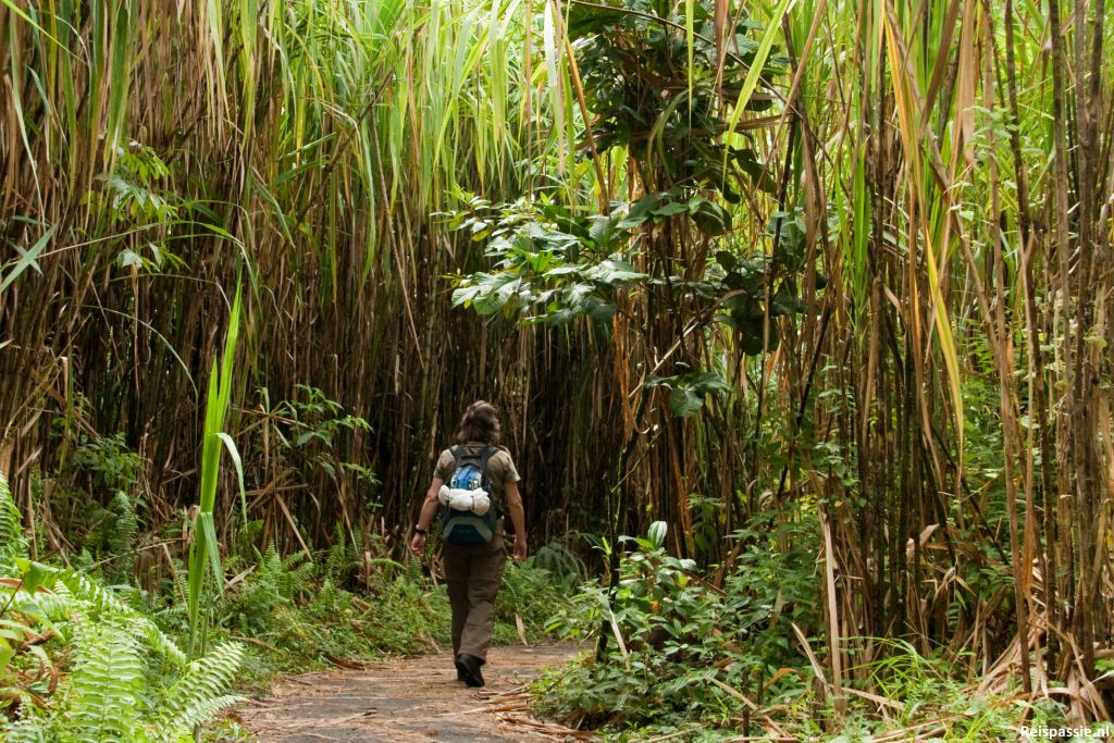 Vanochtend vroeg de bus gepakt naar het rangerstation aan de andere kant van de vulkaan. Bij een splitsing afgezet van waar het nog een eindje lopen is naar de ingang van het park. Halverwege met een auto meegelift en voor de ingang laten afzetten. Er zijn hier in het “Volcan Arenal National Park” een aantal wandeltochten uitgezet die we willen gaan lopen. Het eerste deel gaat door metershoog gras.