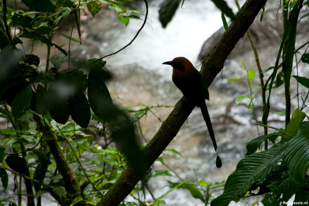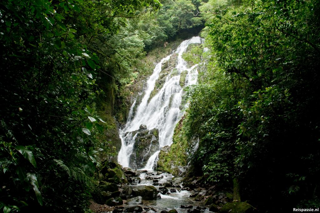 Volgende dag in El Valle lopen we het dorp uit richting bergen om een waterval te bekijken De omgeving is hier werkelijk prachtig. Puntige bergen geheel begroeid met regenwoud. De waterval is tegenwoordig onderdeel van een canopy (kabelbaan) gebeuren en er word entree gevraagd voor bezichtiging. Wel een mooi pad uitgezet door het bos naar de waterval. Het is een klein rondje maar mooie uitzichten op rivier, bos en waterval. We zien ook nog een aantal prachtige vogels. Oranje kop en een helblauw lichaam en lange staart met “druppel” er onder.