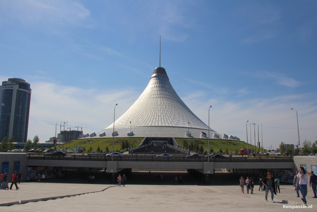 Maar rond een uur of elf zijn we weer fris en fruitig en is het tijd om de stad in te gaan. Astana is een moderne stad. Het grootte gedeelte is in de afgelopen 20 jaar uit de grond gestampt. En daarbij hebben ze alle ruimte genomen want die is er tenslotte genoeg hier op de steppe. En dus is alles even ruim. Brede wegen, minimaal vierbaans, met groenstroken en voetpaden door heel de stad. En heel veel gebouwen die al even groot en opvallend zijn. Architectonische hoogstandjes met veel glas. Een soort Dubai in de steppe.