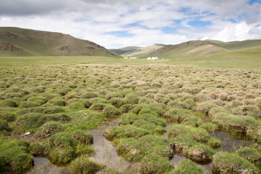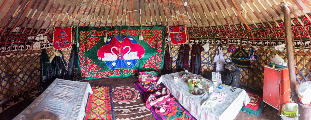 Wij rijden nog zeker dik een half uur verder langs het meer over een spoor wat door het grasland loopt. Onderweg stoppen we nog even bij een stenen monument wat eenzaam als enige massieve gebouw in deze enorme vlakte staat. Uiteindelijk bereiken we in een verre uithoek de yurts waar we zullen gaan overnachten. Het zijn er vier, eentje voor de familie, een wat grotere om te eten en twee voor wie er zoal langskomt. Ze zijn van binnen fraai gedecoreerd.