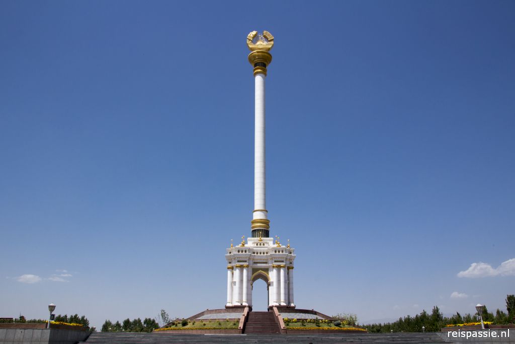 De volgende dag de highlights in de stad langs. Het is wederom erg warm dus we pakken maar even een bus richting centrum. Eerst naar het standbeeld van Ismoil Somoni, de vader van de natie. Hij staat voor een enorme boog met een kroon er op. Je mag niet al te dichtbij komen, er komt al snel een mannetje met enorme pet vertellen dat we moeten wieberen. Vanaf hier gelopen langs een enorme reeks fonteinen naar een monument aan de andere kant van deze wandelavenue. Het is niet erg druk hier, zal wel door de warmte komen. Zo lopen we eigenlijk de hele ochtend door een parkachtige omgeving en pakken ook nog even het presidentiële paleis en standbeeld van Rudaki mee. Heel aangenaam groen centrum heeft Dushanbe. Vroeg gaan lunchen in een restaurant in een enorm open gebouw. Je zit hier prima ondanks de warmte. Weer eens lekker aan de laghman!