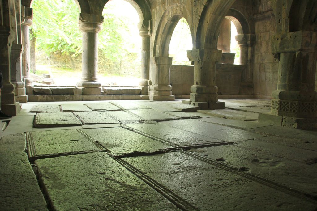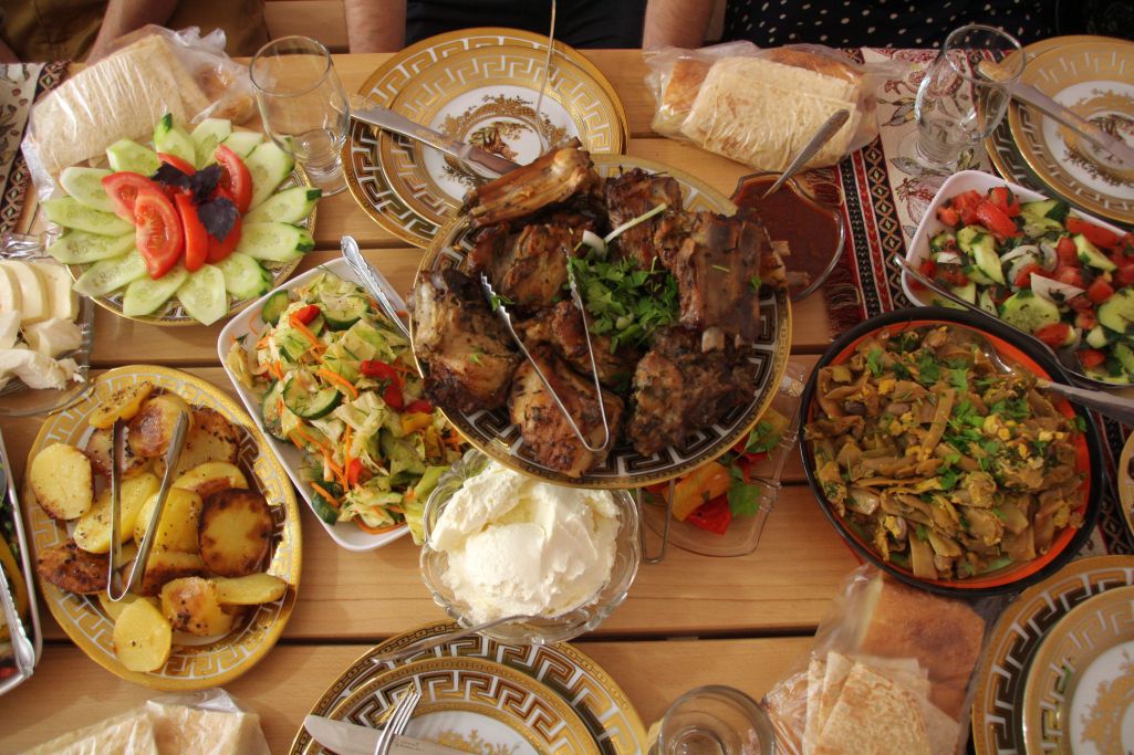 Daarna bezoeken we de kloosters van Sanahin en Haghpat. Het zijn enorm oude kloosters die niet meer in gebruik zijn. Delen van de kloosters zijn al van het jaar 900. Ze zijn opgebouwd uit enorme basalt blokken en ook heerlijk koel van binnen. In de muren zijn kruizen uitgehouwen. Prachtig om hier rond te dwalen. Ooit waren ze ook voorzien van fresco’s tegen de muren maar die zijn tijdens de Russische overheersing allemaal verwijderd. Na deze twee bezoeken lunchen we bij mensen thuis in een van de dorpjes. Geweldig gegeten! Een enorme tafel vol met lekkers staat voor ons klaar. En met als extra nog een borrel, want de zoon des huizes is geslaagd voor een examen. Was super.