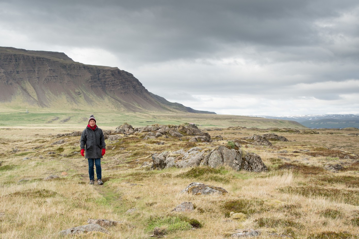 We passeren nog een mooie hoogvlakte en dalen dan weer af naar zeeniveau. Bij Flokalundur is een fraaie natuurlijke hottub; de Hellalaugur. Het is een poel tegen de rotswand aan met uitzicht over de drooggevallen stukken zee. Heerlijk een uurtje gezeten. Eerst met een stel Engelsen, daarna hadden we het moois weer voor onszelf.