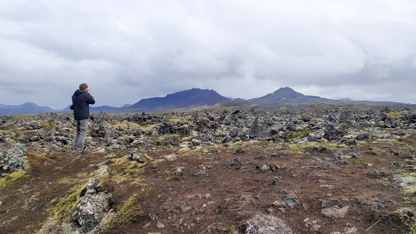 Dan het laatste stuk tot Grandarfjordur. We komen eerst door een prachtig lavagebied. De grote grillig gevormde lavarotsen zijn roodbruin en er groeit enorm veel geel mos tussen. Met de grijzen wolken van vandaag en af en toe een streepje zon een prachtig plaatje.