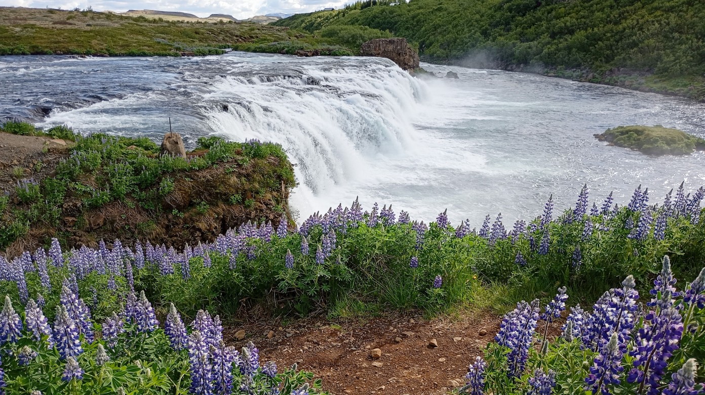 Dan doorgereden tot Hella. Hier op de camping gaan staan. Een groot vierkant veld. Maar wel met de rest van de dag heerlijk weer. We kunnen gewoon weer eens even buiten in de stoeltjes zitten. Aan het eind van de dag een rondje gaan lopen. Er loopt hier vlakbij een rivier en ook daar is, wederom, een waterval. Wel een mooi plekje om even lekker in het gras te zitten. Langs de rivier teruggelopen. De waterkant staat vol met bossen gele dotterbloemen en even hoger op de oever ziet het paars van de lupines. In het water zwemmen kleine stellopertjes die als eenden heel snel heen en weer schieten in het water op zoek naar eetbaars. Nog even staan kijken bij een paardensport evenement wat naast de camping aan de gang is en dan is het rondje compleet.