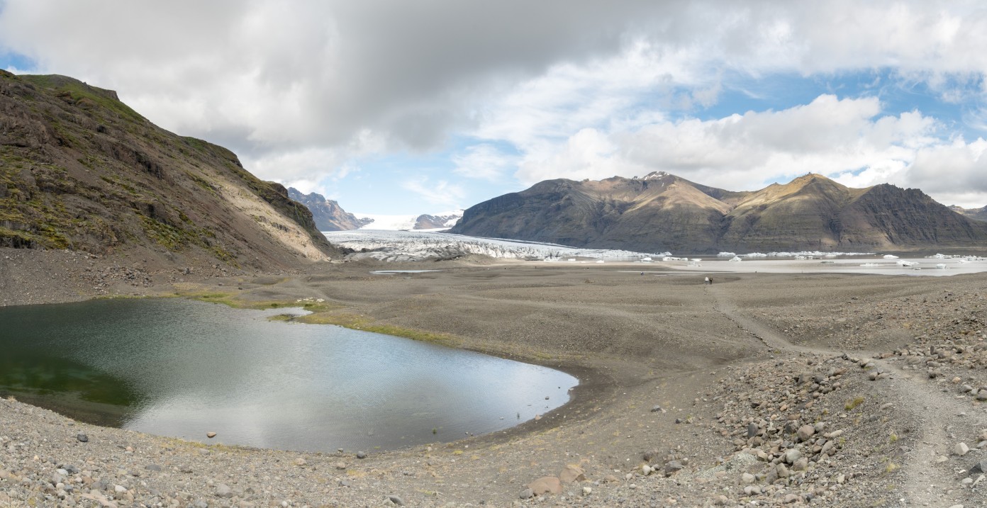 Dit is een uitloper van de Vatnajokull gletsjer, de grootste van IJsland. Hier een plekje op de camping gezocht en vanaf de camping naar de gletsjer gewandeld. Deze ziet aanmerkelijk minder zwart dan de vorige en heeft een gletsjermeer waar ijsschotsen in drijven. Bij het visitorcenter stond vermeld dat als al het ijs van deze gletsjer evenredig over IJsland verdeeld zou worden heel IJsland onder een laag van 28 meter ijs zou liggen. Ongelooflijk hoeveel ijs er in dit veld aanwezig is.